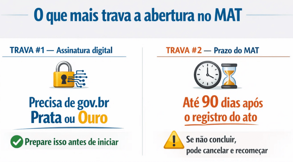 Outro ponto que merece atenção é o prazo para concluir a etapa do MAT após o registro do ato constitutivo. Existe previsão de até 90 dias para acessar e finalizar a solicitação; se esse prazo não for cumprido, o processo pode ser cancelado e precisar recomeçar.